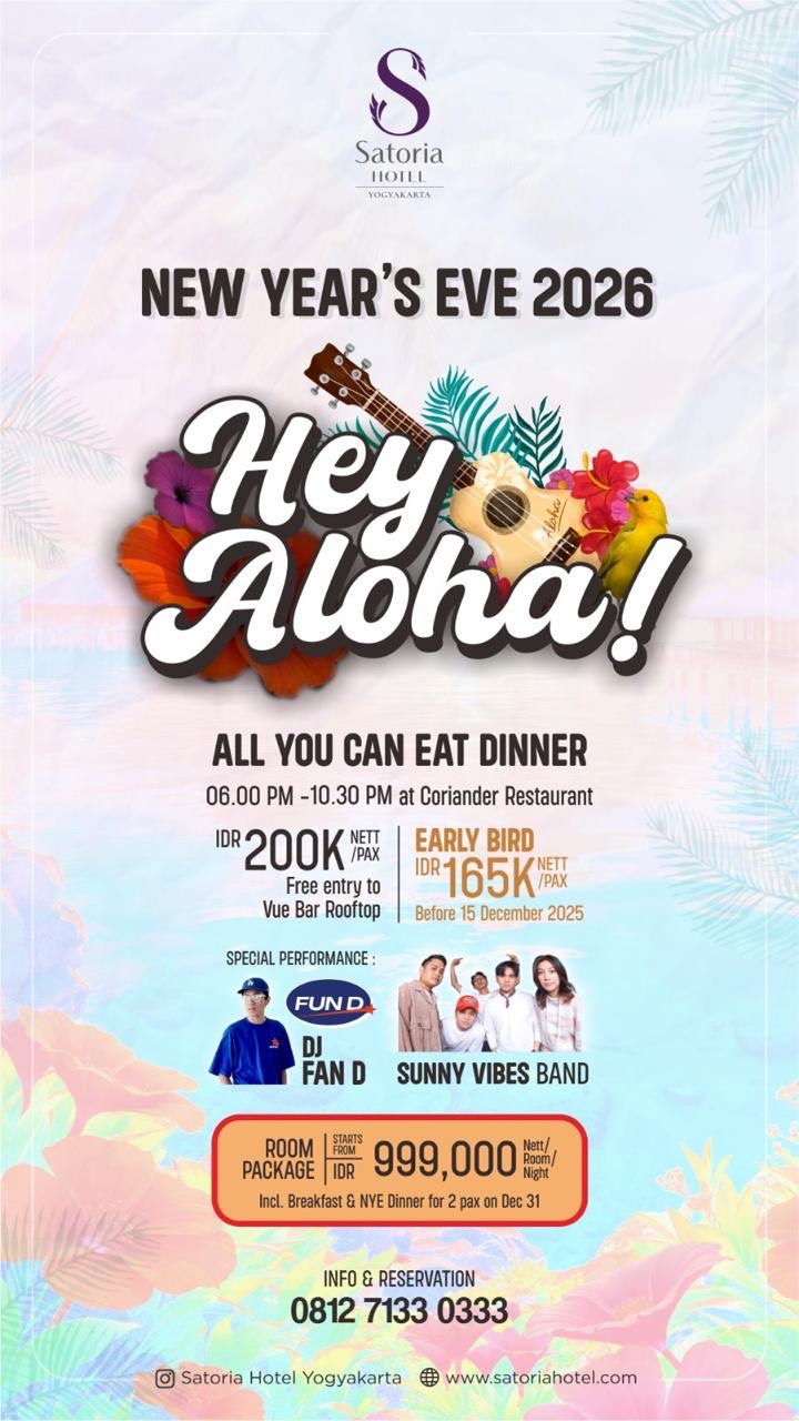 Malam pergantian tahun di Satoria tahun ini bakal beda banget! Mengusung tema “Hey Aloha!”, pesta tahun baru pada 31 Desember 2025 ini menghadirkan konsep tropis yang fun, vibrant, dan penuh energi.