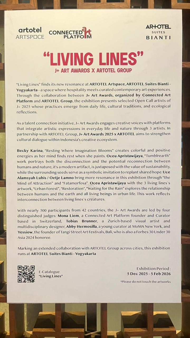 YOGYAKARTA — Pameran seni kontemporer “Living Lines” resmi menemukan rumah barunya di ARTOTEL Artspace, ARTOTEL Suites Bianti – Yogyakarta, menghadirkan pengalaman artistik yang memadukan keramahan khas hotel butik dengan kurasi seni kontemporer kelas global.